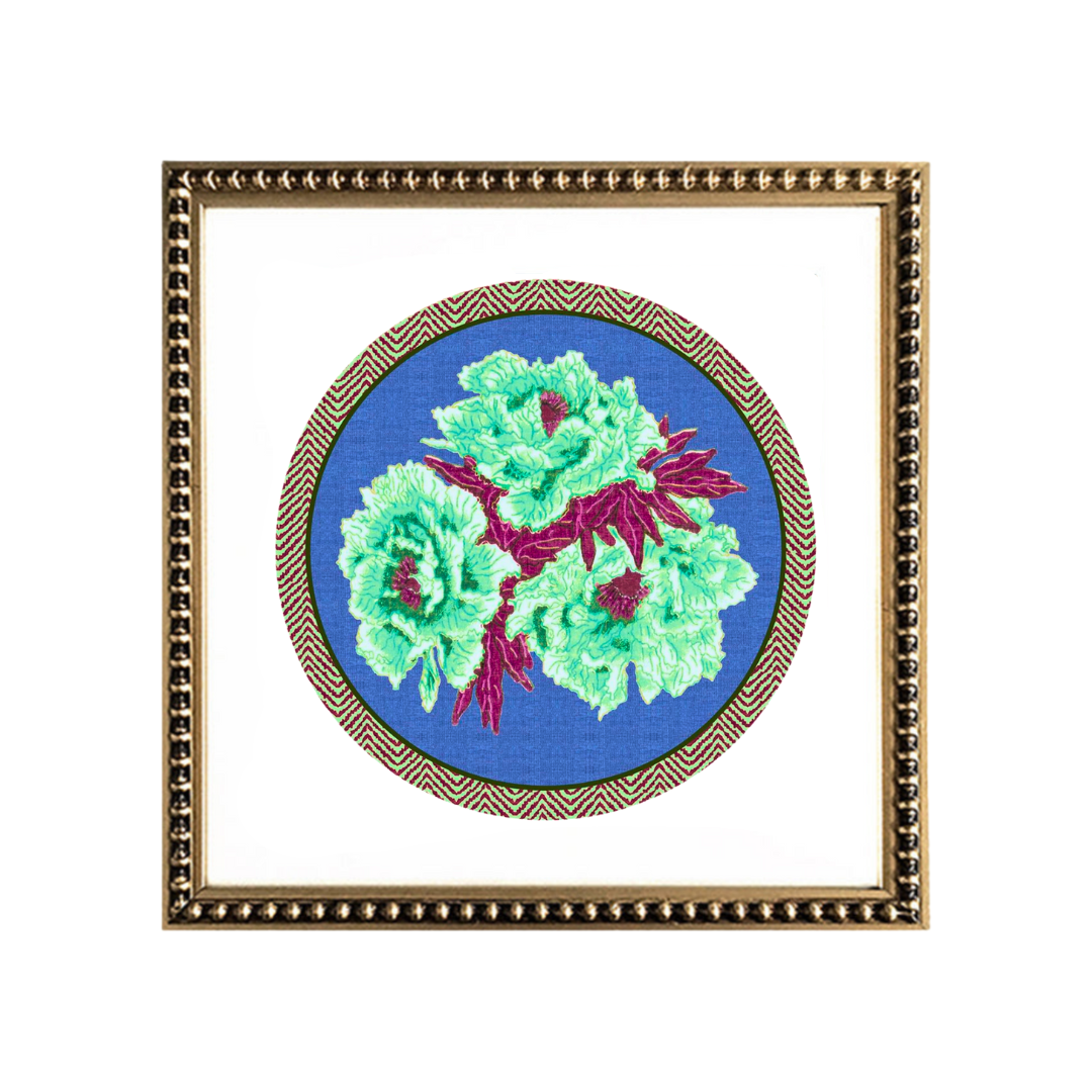 Cuadro de diseño de flores circular con fondo blanco y marco de madera perlas color dorado.