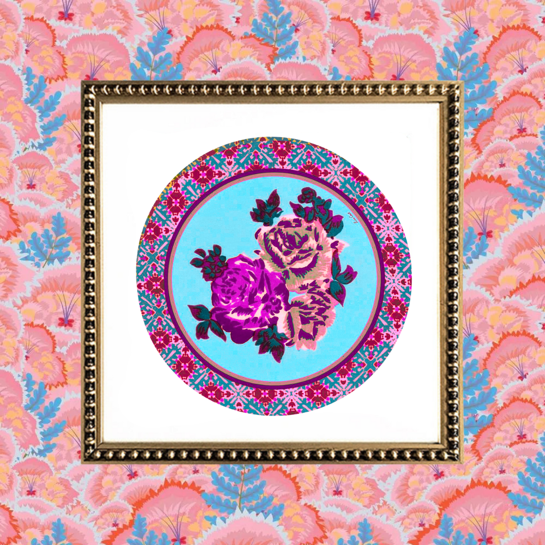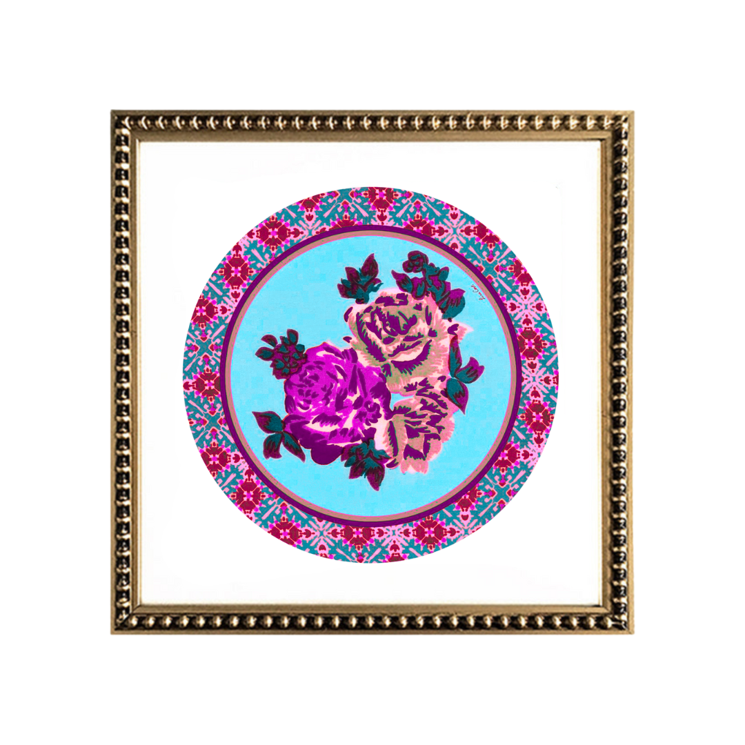 Cuadro de diseño de flores circular con fondo blanco y marco de madera perlas color dorado.