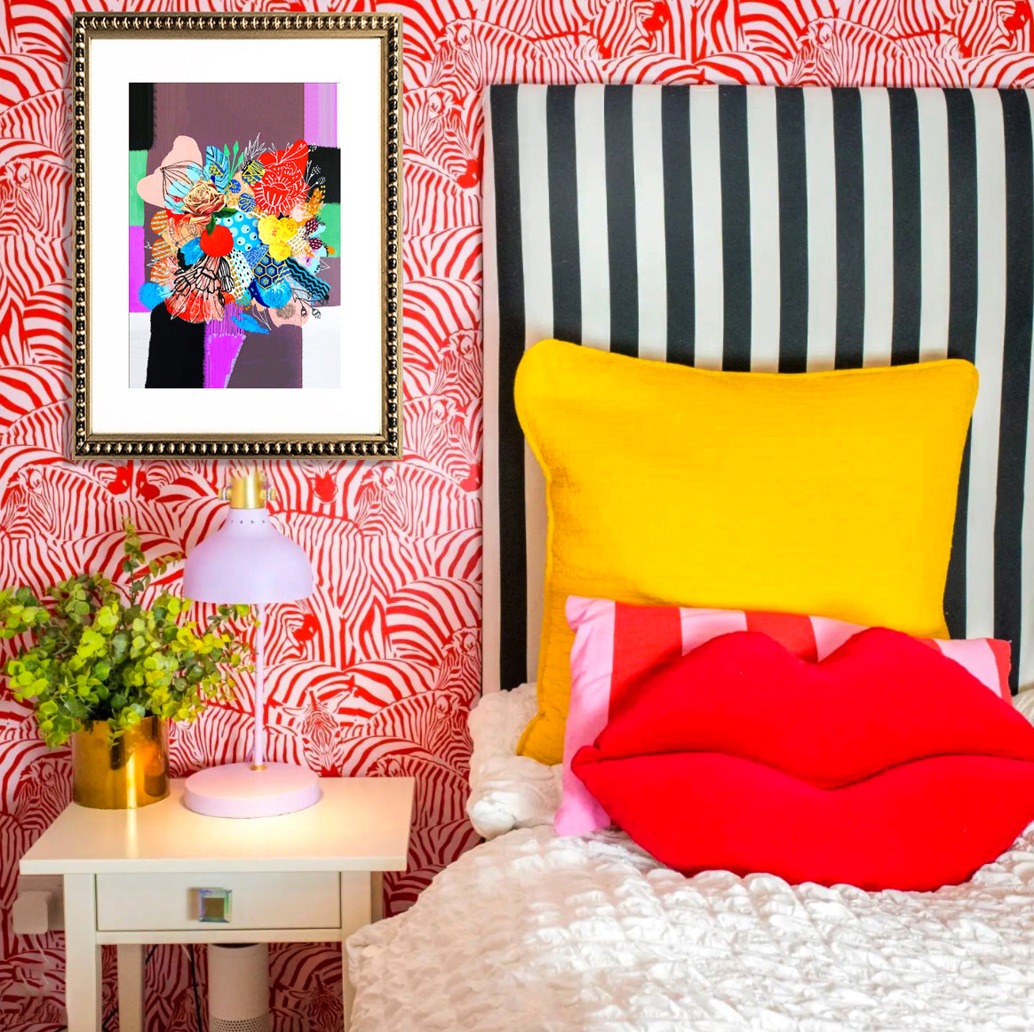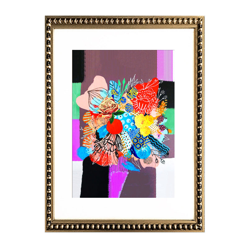 Cuadro con diseño en collage en paleta de colores, paspartú blanco y marco de madera con perlitas color dorado envejecido.