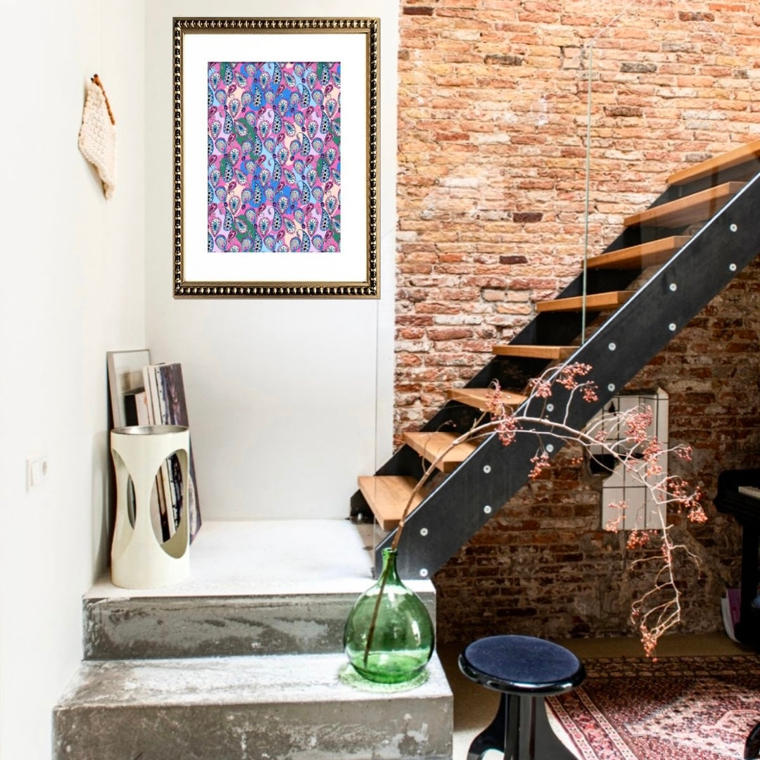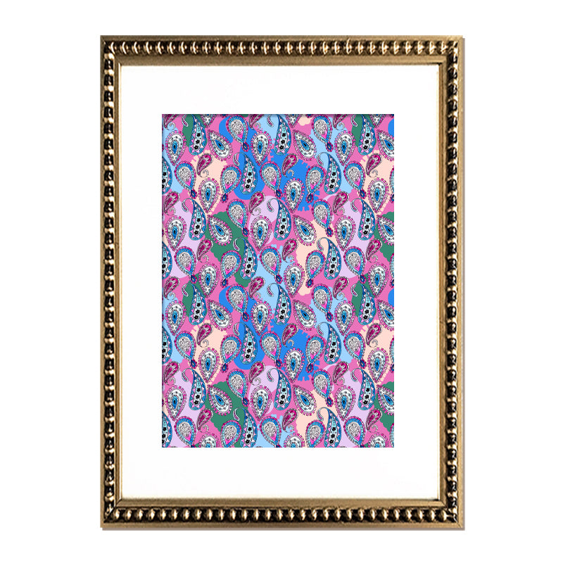 Cuadro de diseños abstractos en colores con fondo azul, paspartú blanco y marco de madera delgado con perlas dorado.