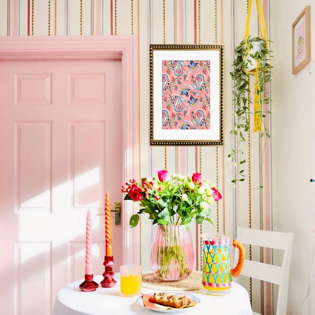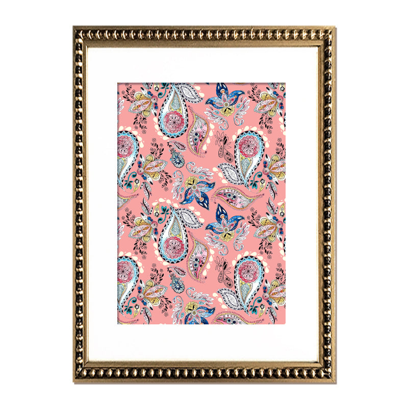 Cuadro con diseño abstracto en colores y fondo rosa, con paspartú blanco y marco de madera delgado de perlas doradas.