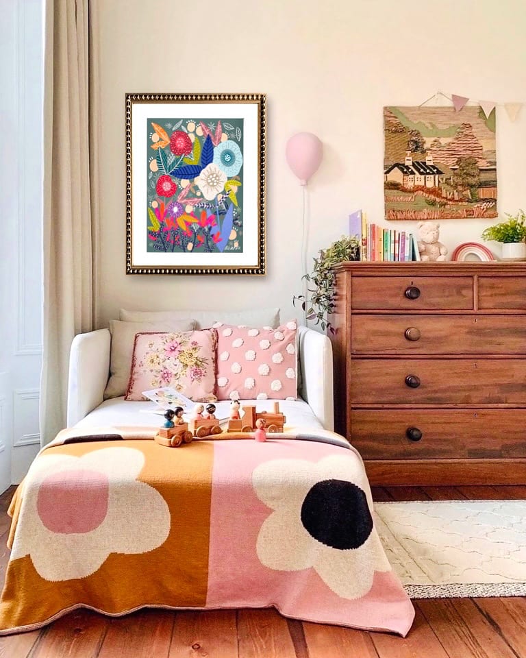 Cuadro de diseño digital de flores de colores en fondo gris, paspartú blanco y marco negro con borde dorado.