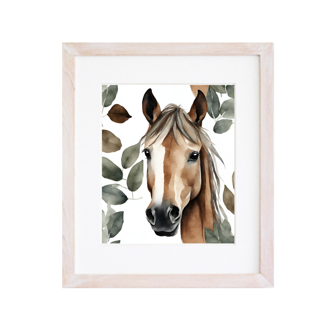 Cuadro con diseño de animalito en acuarela y hojas de eucalipto, paspartú blanco y marco de madera albayalde blanco.