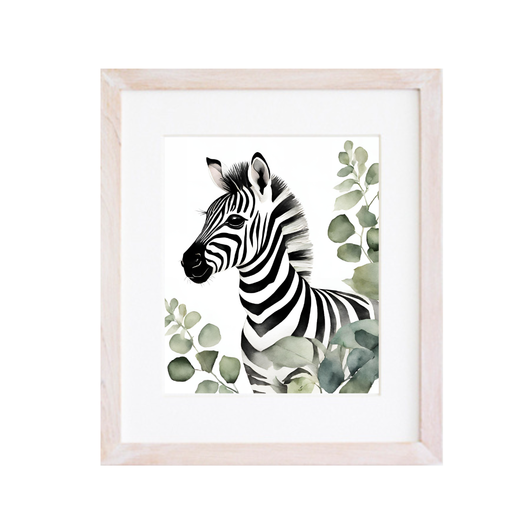 Cuadro con diseño de animalito en acuarela y hojas de eucalipto, paspartú blanco y marco de madera albayalde blanco.