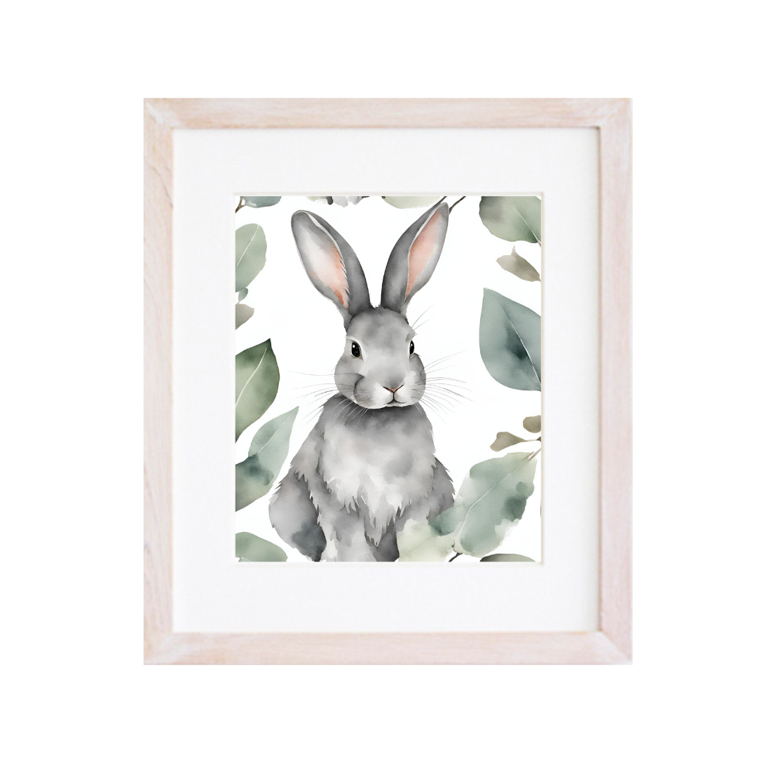 Cuadro con diseño de animalito en acuarela y hojas de eucalipto, paspartú blanco y marco de madera albayalde blanco.