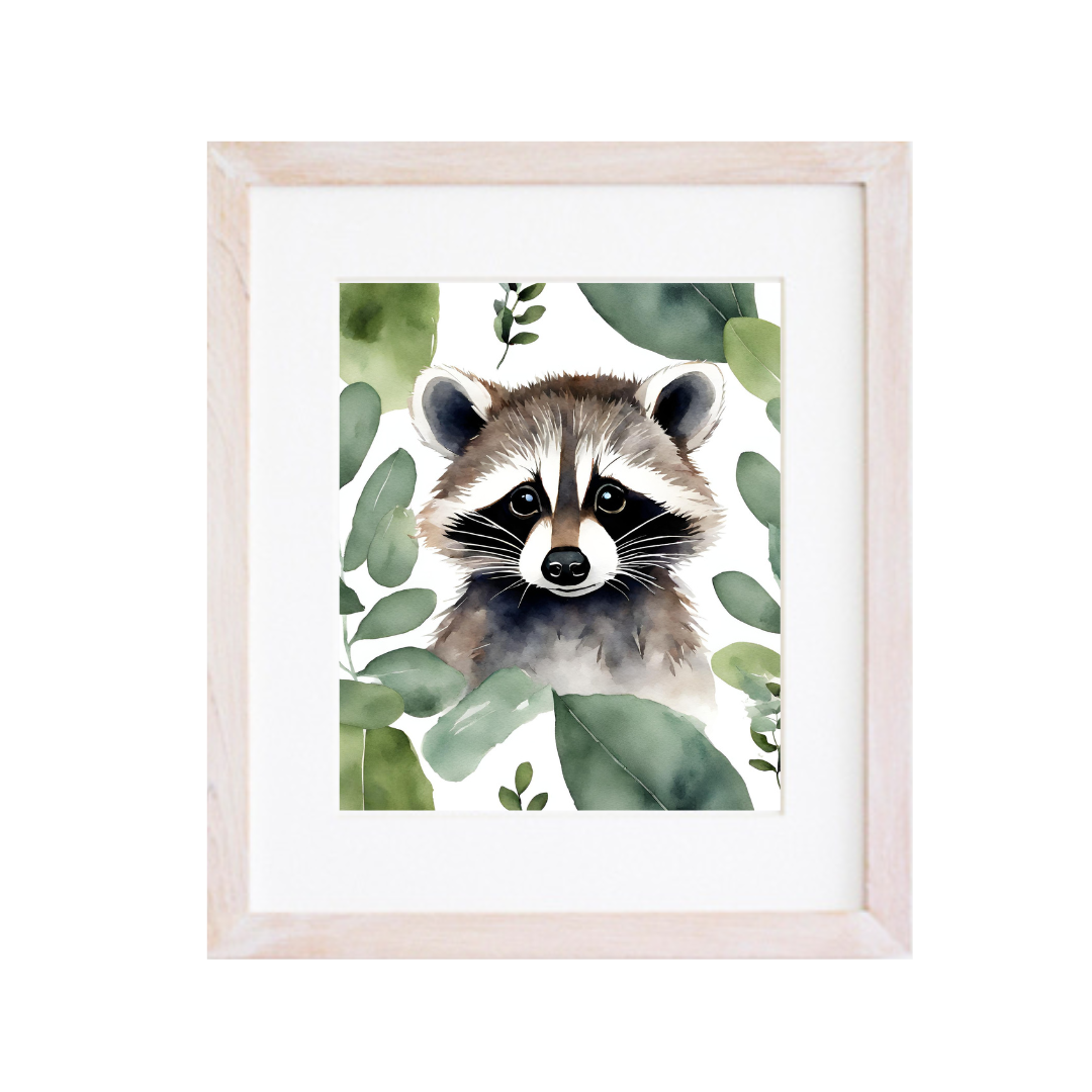 Cuadro con diseño de animalito en acuarela y hojas de eucalipto, paspartú blanco y marco de madera albayalde blanco.