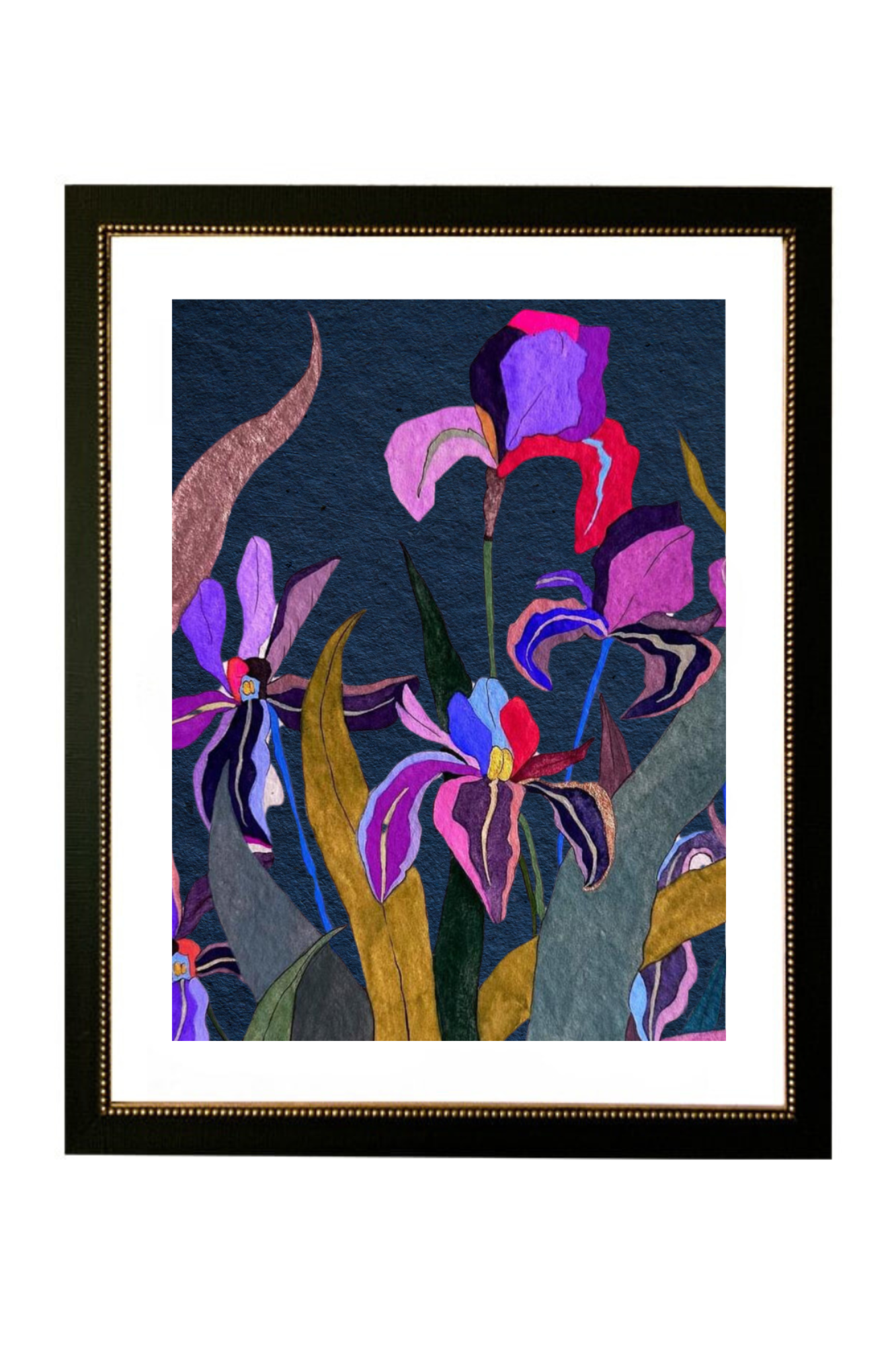 Cuadro de flores, paspartú blanco y marco de madera negro con mini perlitas color dorado envejecido.
