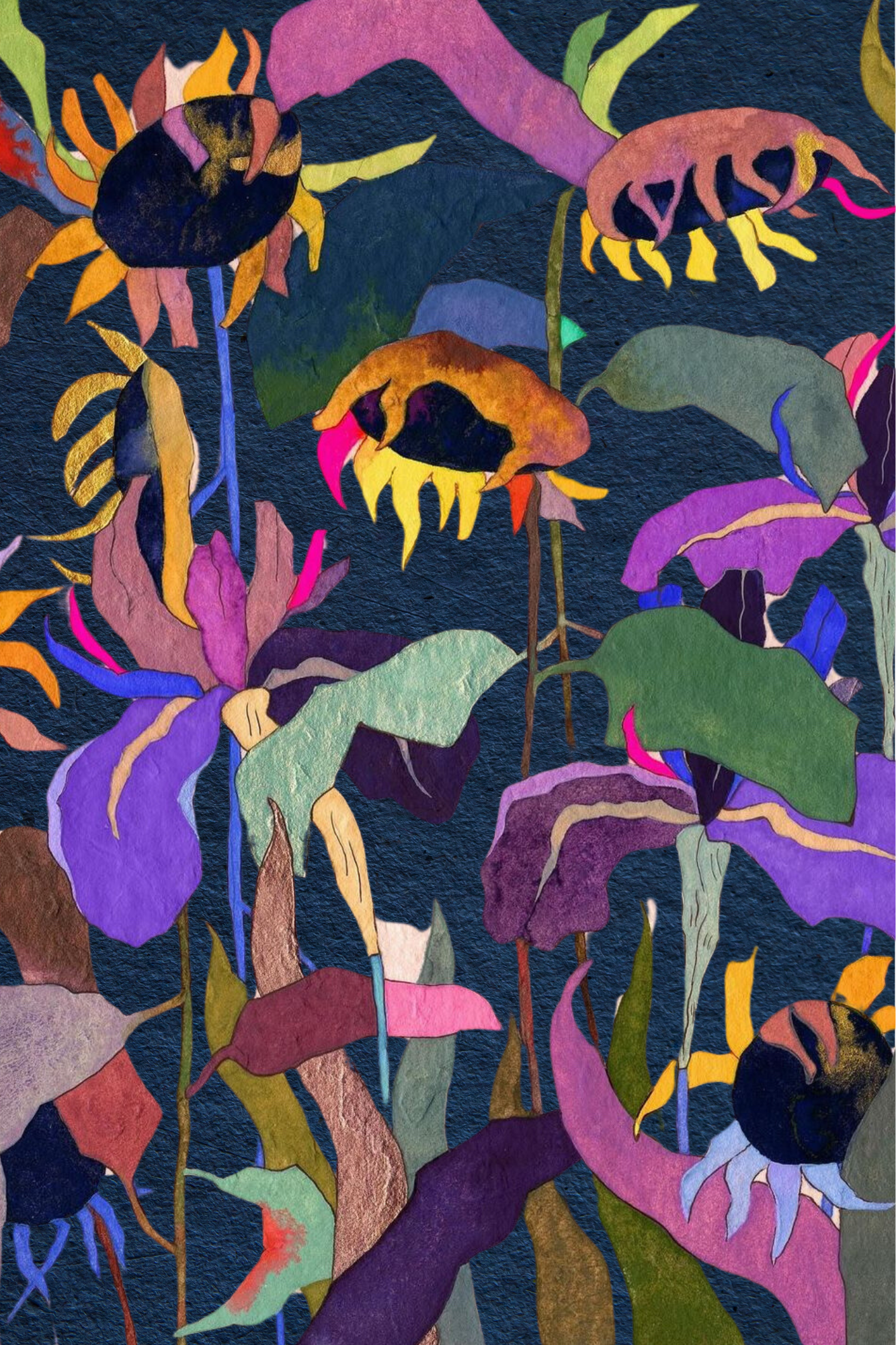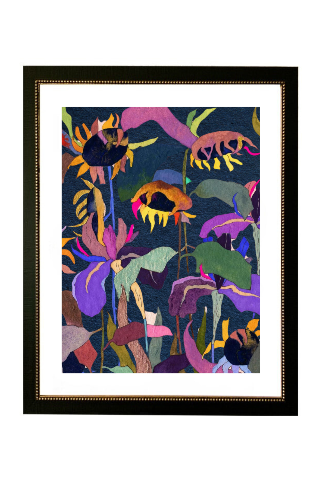 Cuadro de flores, paspartú blanco y marco de madera negro con mini perlitas color dorado envejecido.