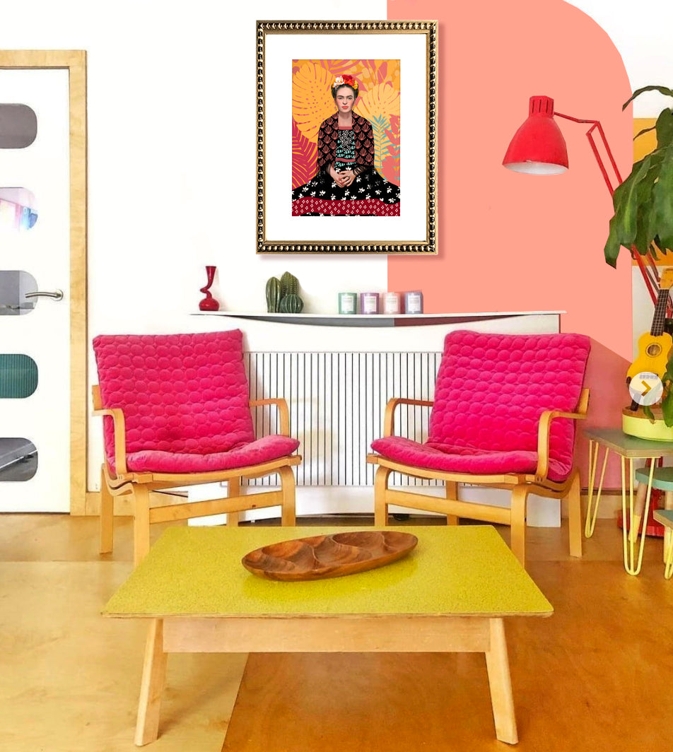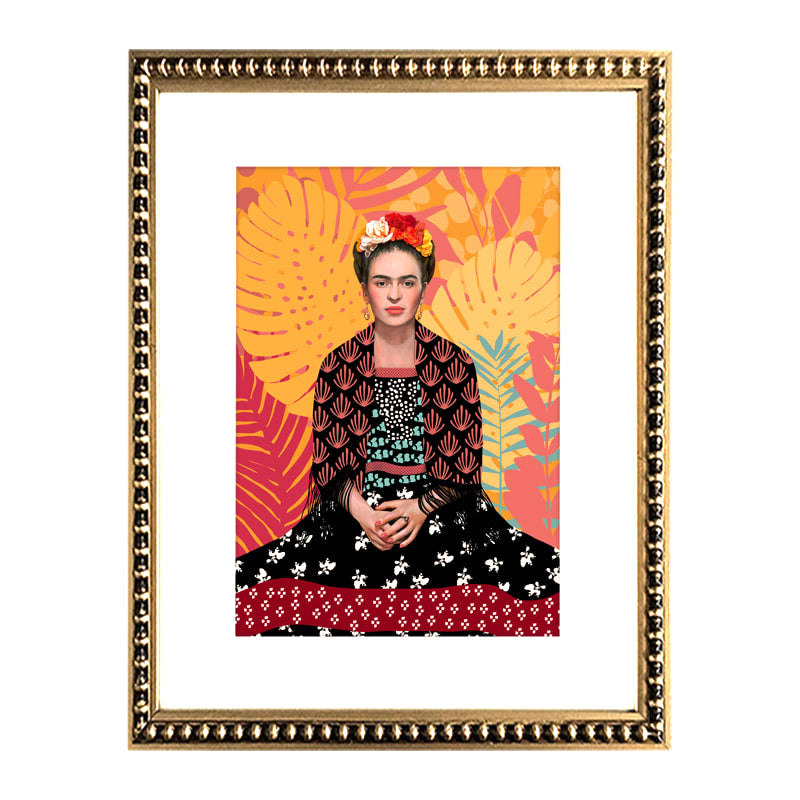 Cuadro de Frida con flores y hojas en naranjo, paspartú blanco y marco de madera con perlas color dorado envejecido.