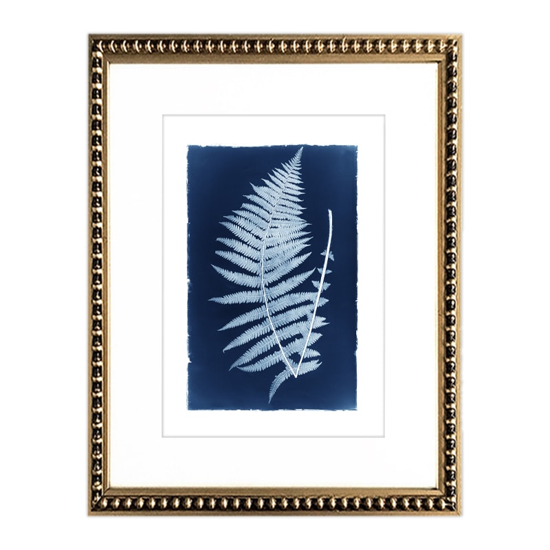 Cuadro de helecho blanco sobre fondo azul, con paspartú blanco y marco de madera con perlas color dorado envejecido.