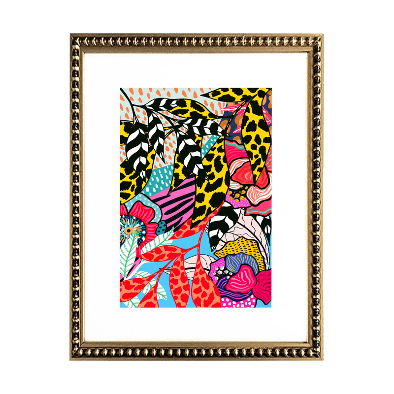 uadro con diseño de hojas y flores en colores con paspartú blanco y marco de madera con perlitas color dorado.