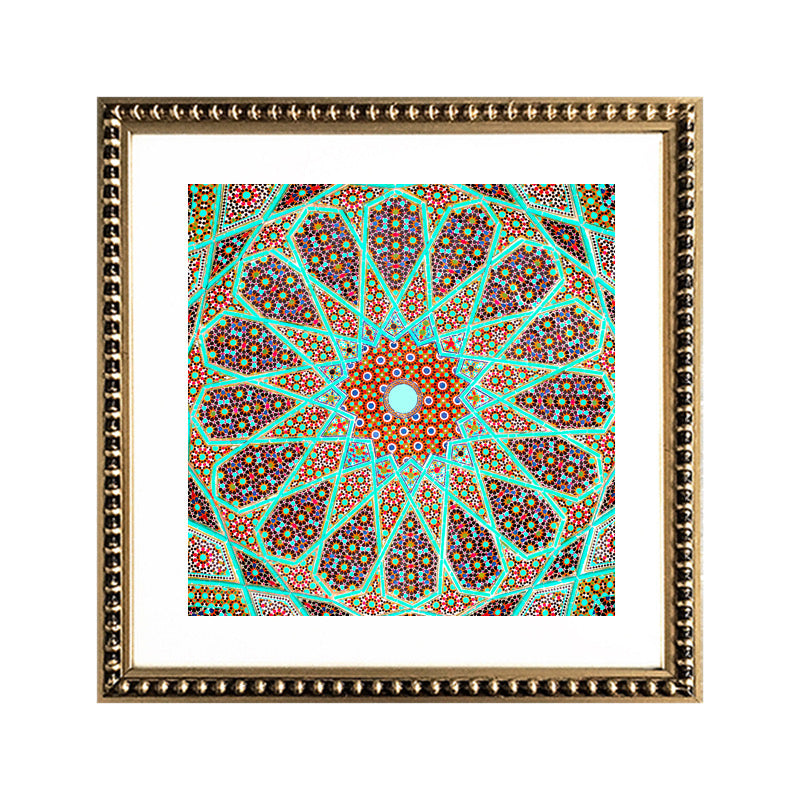 Cuadro con diseño de tejido indio en colores, estilo India Chic, paspartú blanco y marco de madera delgado dorado con perlitas.