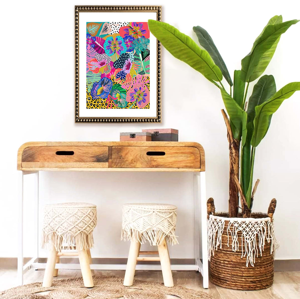 Cuadro de ilustración digital de jungla de flores en color, paspartú blanco y marco perla oro.