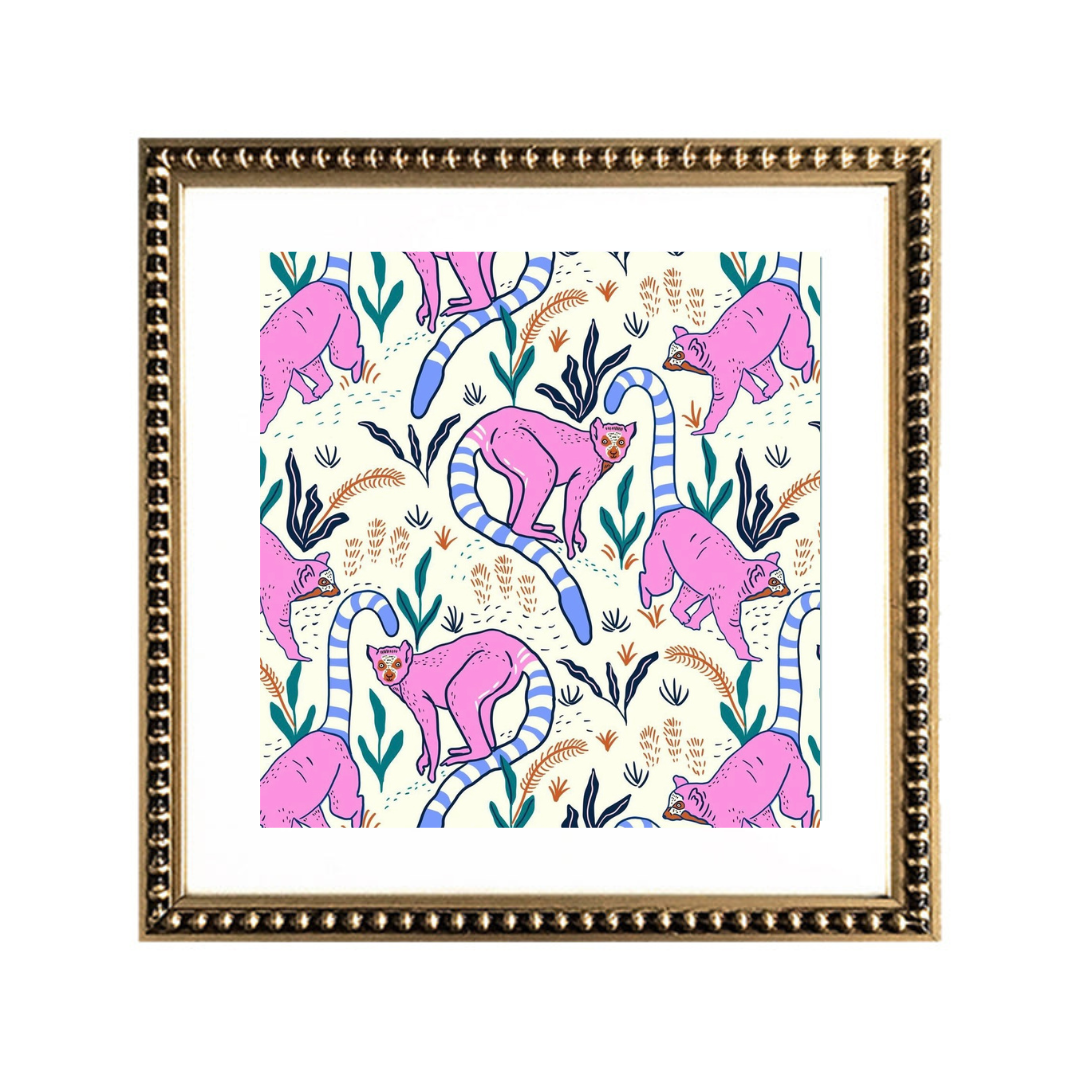 Cuadro de diseño de lemur rosa con fondo crema,  paspartú blanco y marco de madera perlas color dorado.