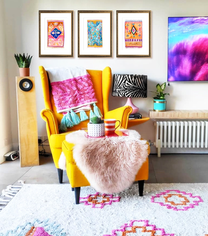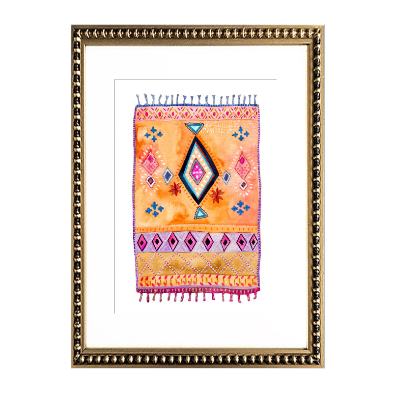 Cuadro reproducción de pintura en acuarela de diseño marroquí con marco de perlas dorado.