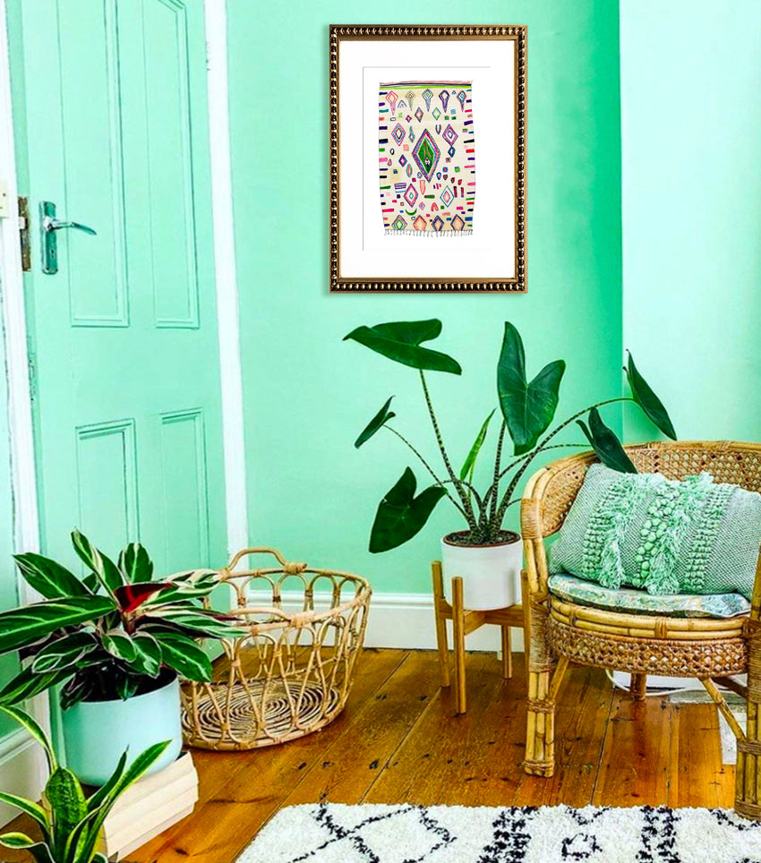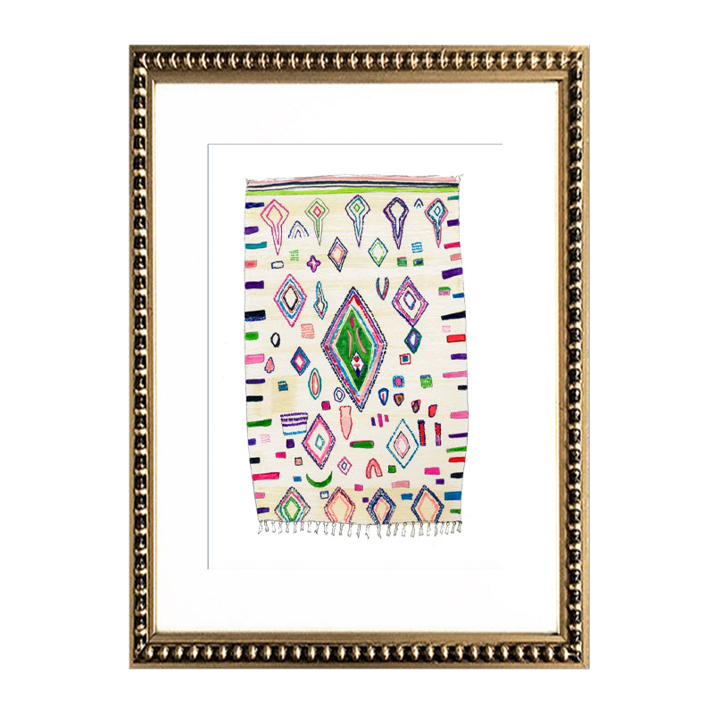Cuadro reproducción de pintura en acuarela de diseño marroquí con marco de perlas dorado.