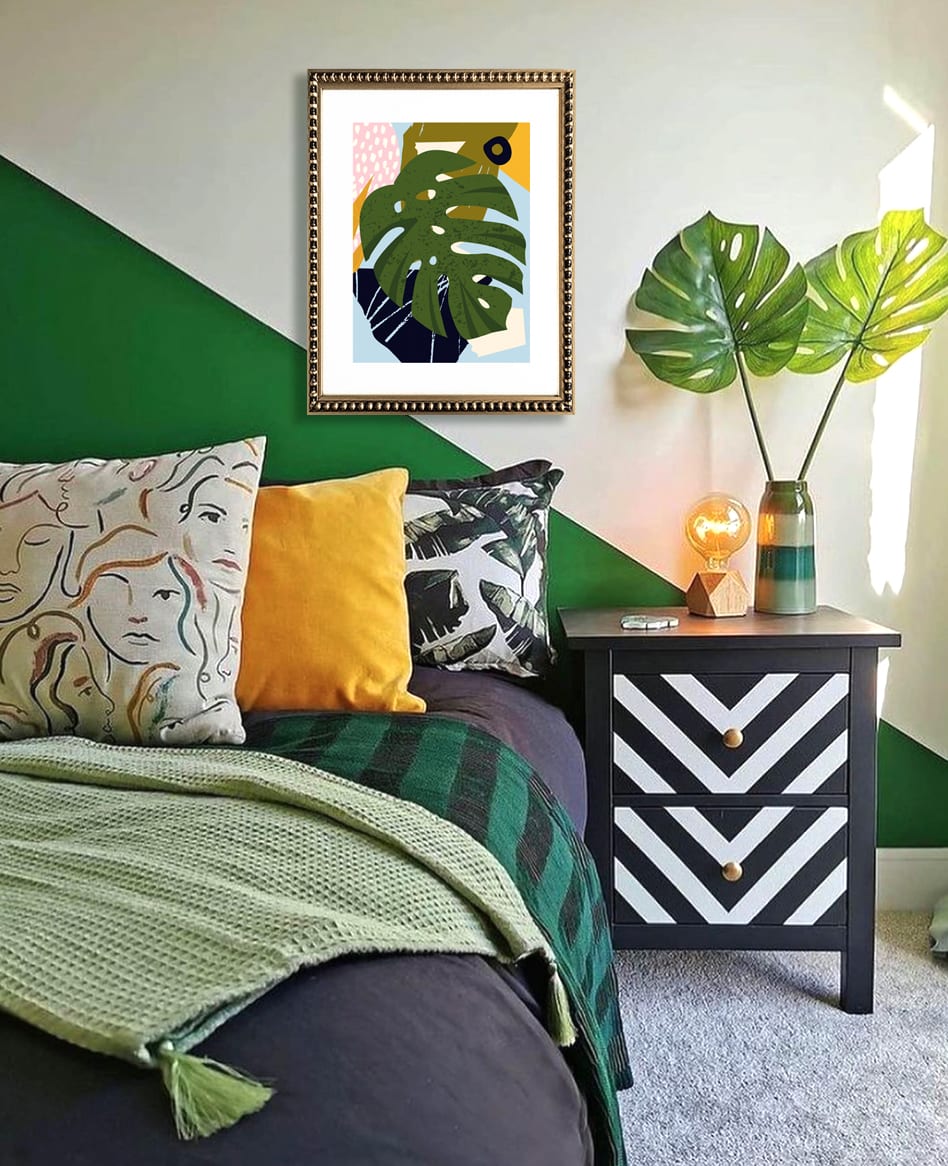 Cuadro de diseño de monstera y abstracto, paspartú blanco, vidrio y marco de madera con perlas color dorado envejecido.