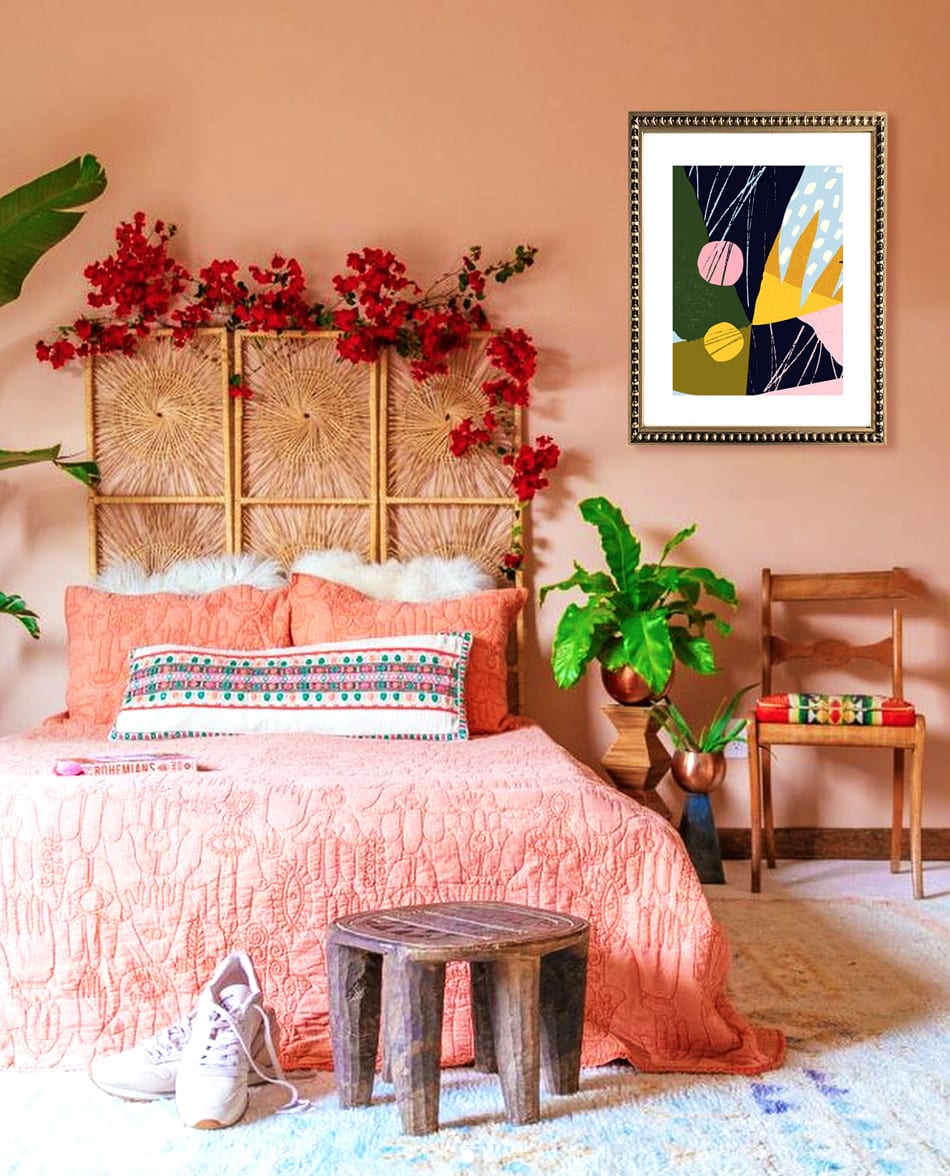 Cuadro de diseño de monstera y abstracto, paspartú blanco, vidrio y marco de madera con perlas color dorado envejecido.