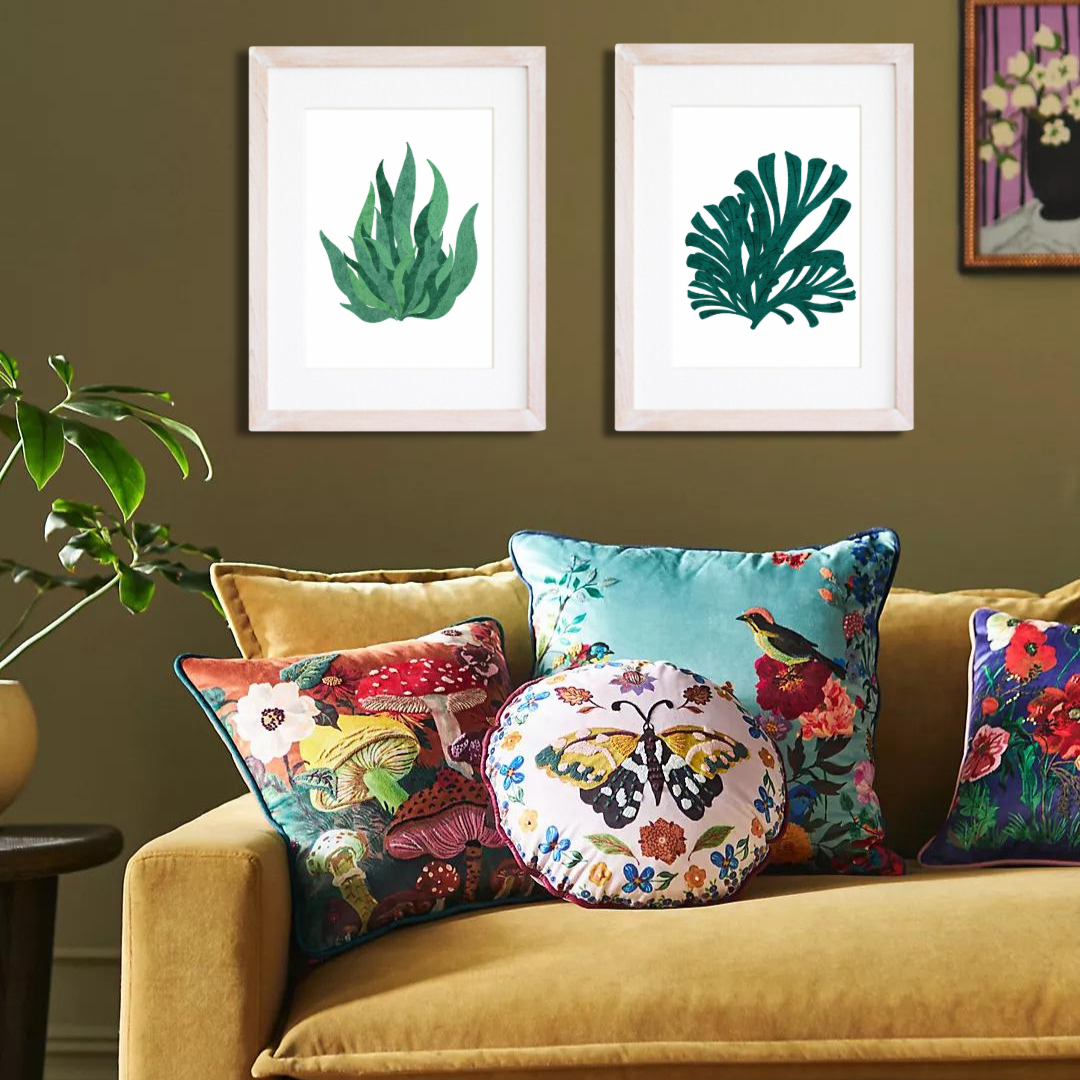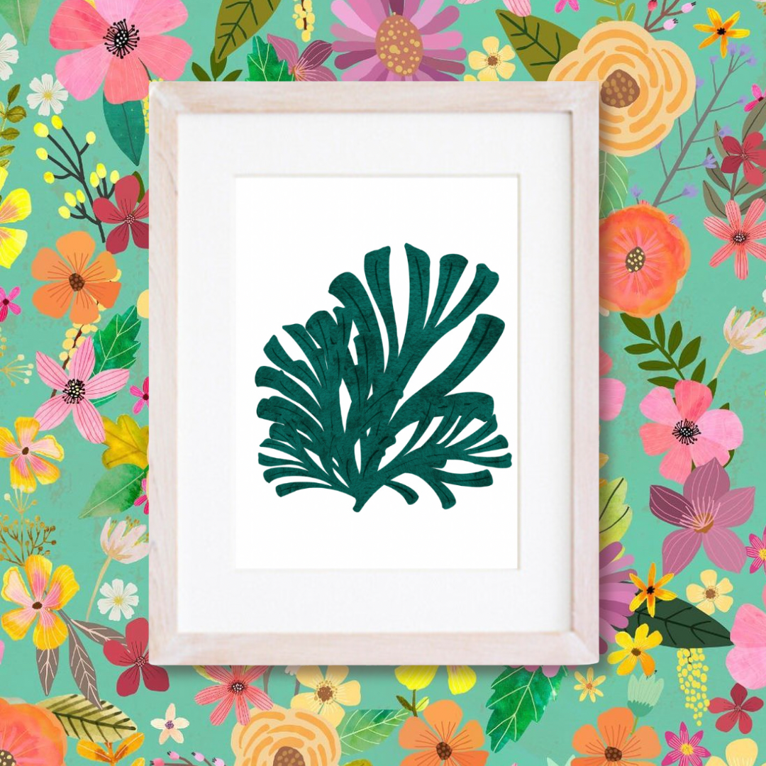 Cuadro con diseño de hojas en acuarela, paspartú blanco y marco de madera albayalde blanco.