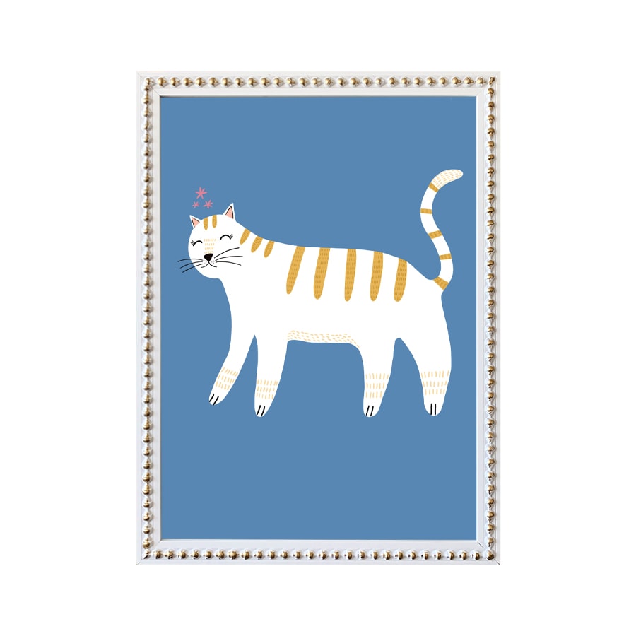 Cuadro diseño gatito niños en marco de madera blanco con perlas doradas.