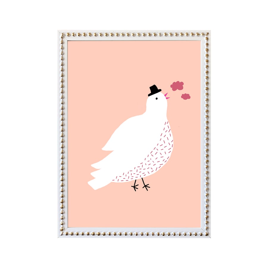 Cuadro diseño palomita blanca niños en marco de madera blanco con perlas doradas.