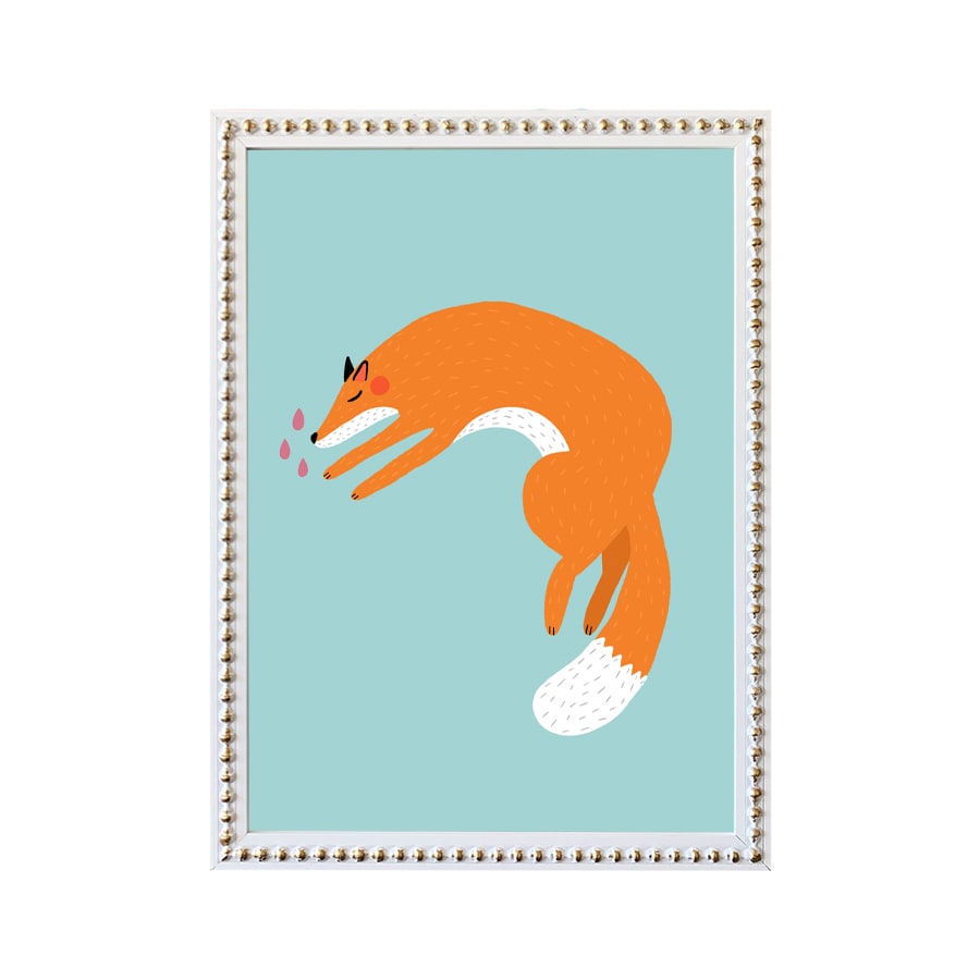 Cuadro diseño zorro niños en marco de madera blanco con perlas doradas.