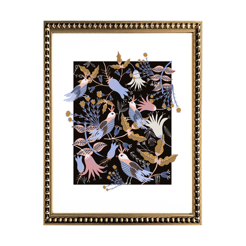 Cuadro de diseño de pajaritos en jardín de flores con paspartú blanco y marco de madera con perlitas color dorado.