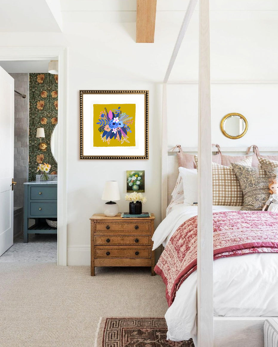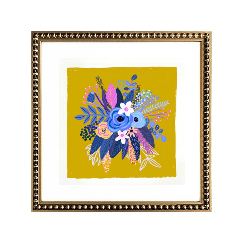 Cuadro de ilustración de ramo de flores de colores en tonos azules, paspartú blanco y marco de madera con perlas color dorado envejecido.