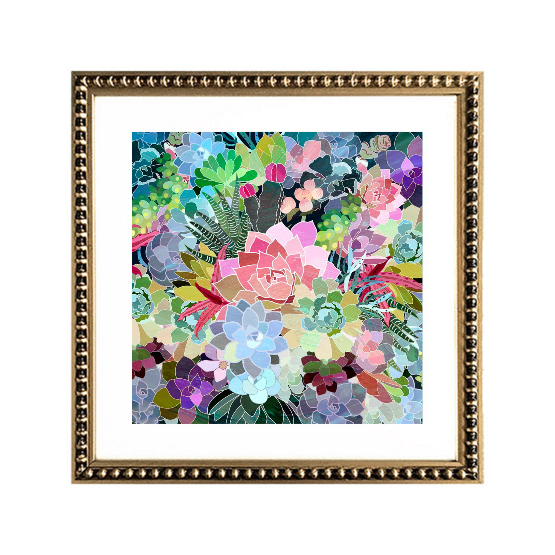 Cuadro con diseño de composición de suculentas, paspartú blanco y marco de madera delgado dorado con perlitas.