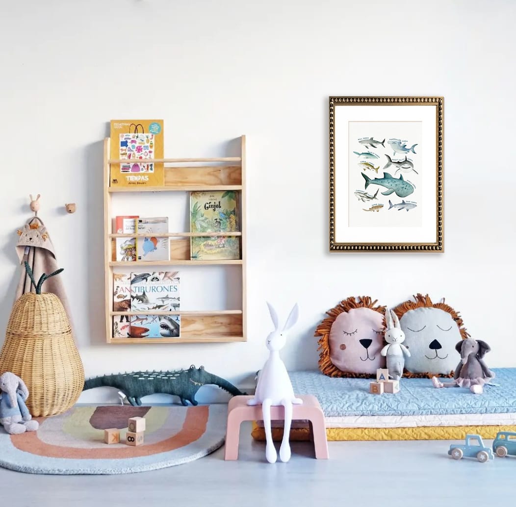 Cuadro de tiburones en reproducción de acuarela, paspartú blanco y marco de madera con perlas color dorado envejecido.