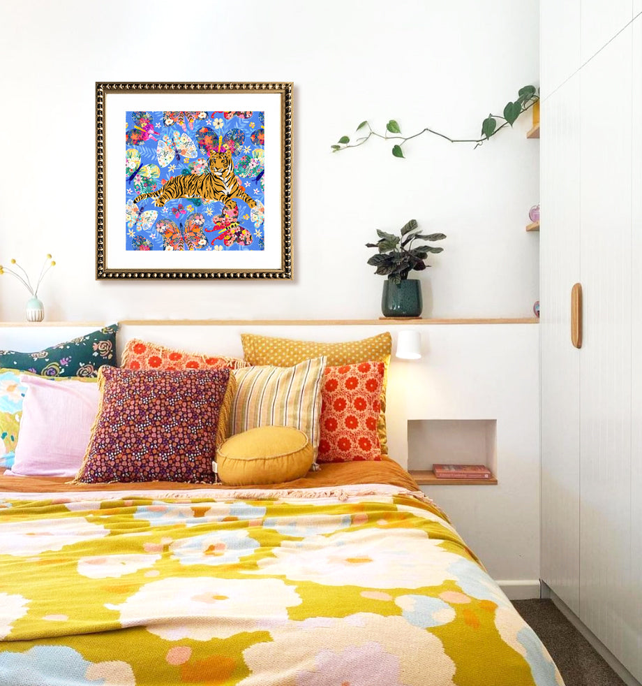 Cuadro de diseño de tigre con fondo de mariposas multicolor, paspartú blanco y marco de madera con perlas color dorado.