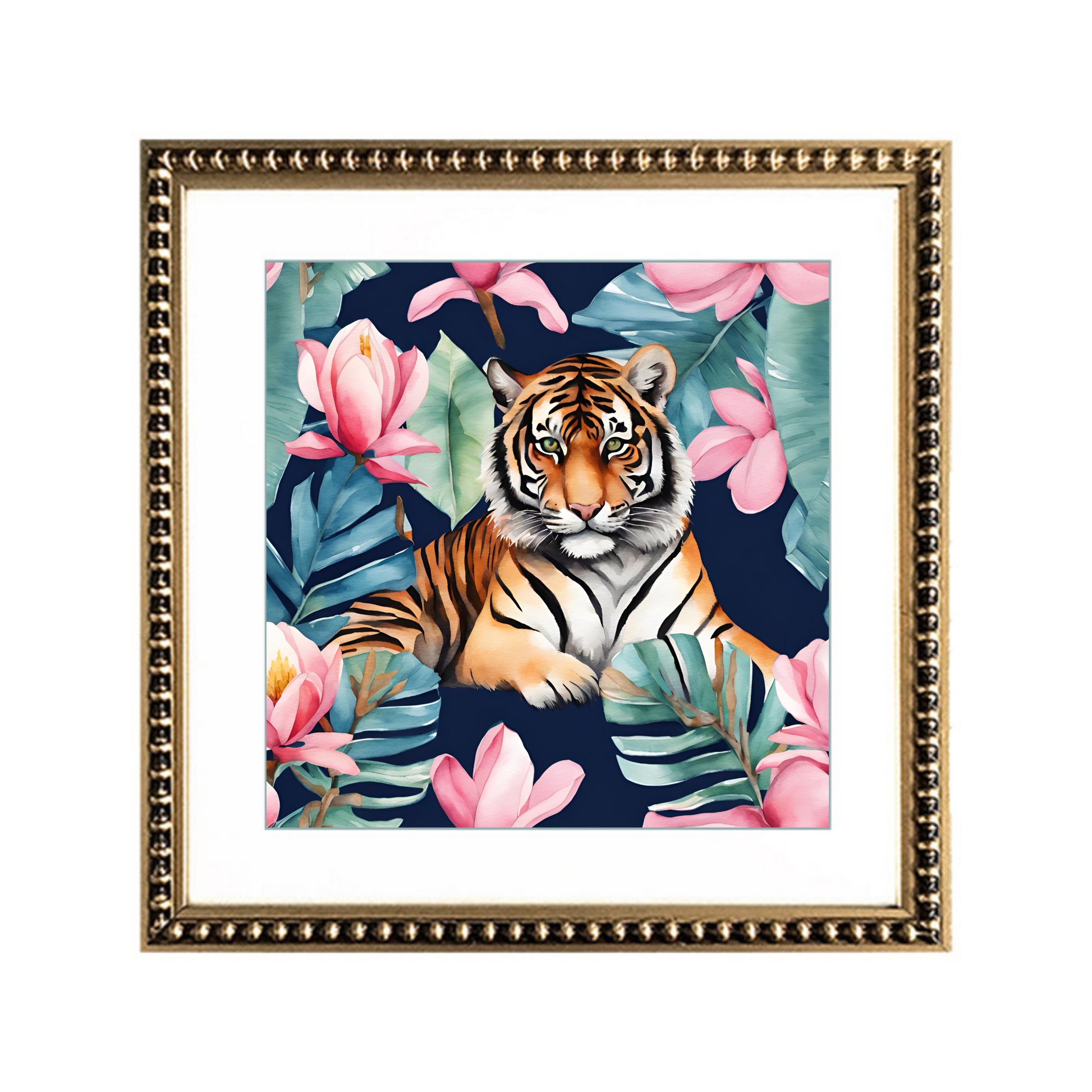 Cuadro con diseño de tigre con selva de hojas y flores en acuarela, paspartú blanco y marco de madera delgado dorado con perlitas.