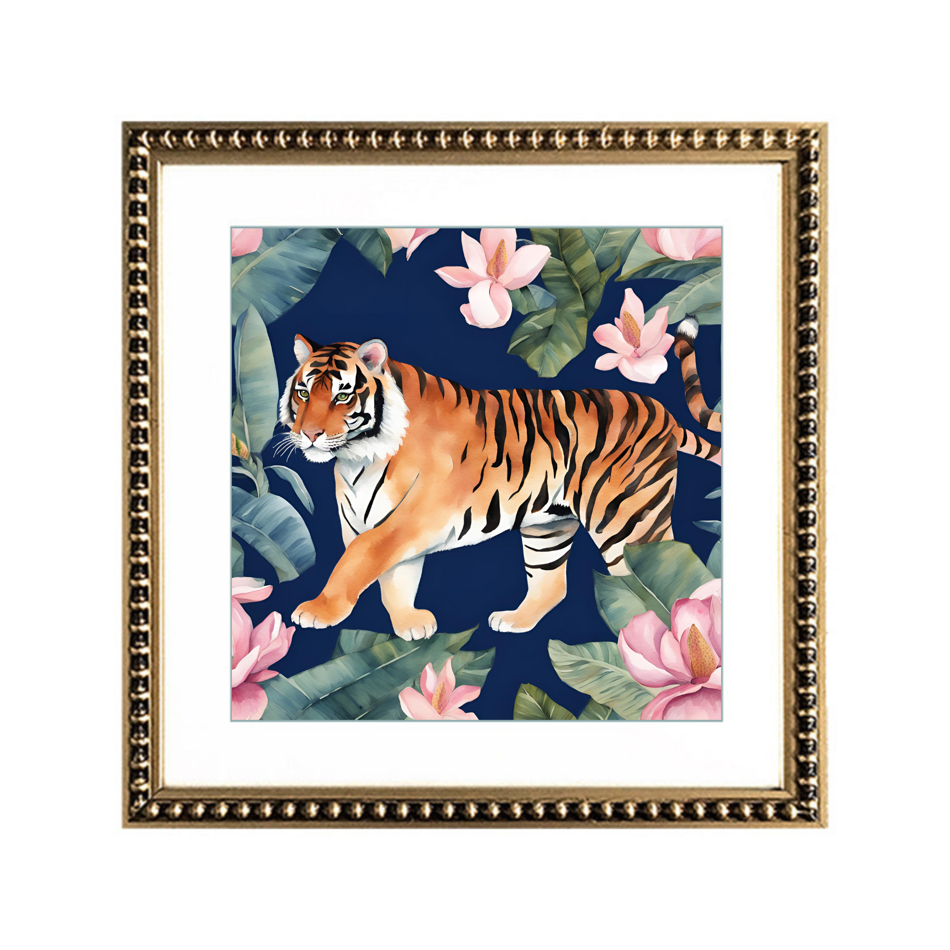 Cuadro con diseño de tigre con selva de hojas y flores en acuarela, paspartú blanco y marco de madera delgado dorado con perlitas.