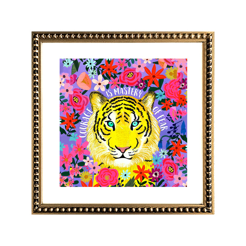 Cuadro de diseño de tigre amarillo y flores con fondo morado, paspartú blanco y marco de madera perlas color dorado.