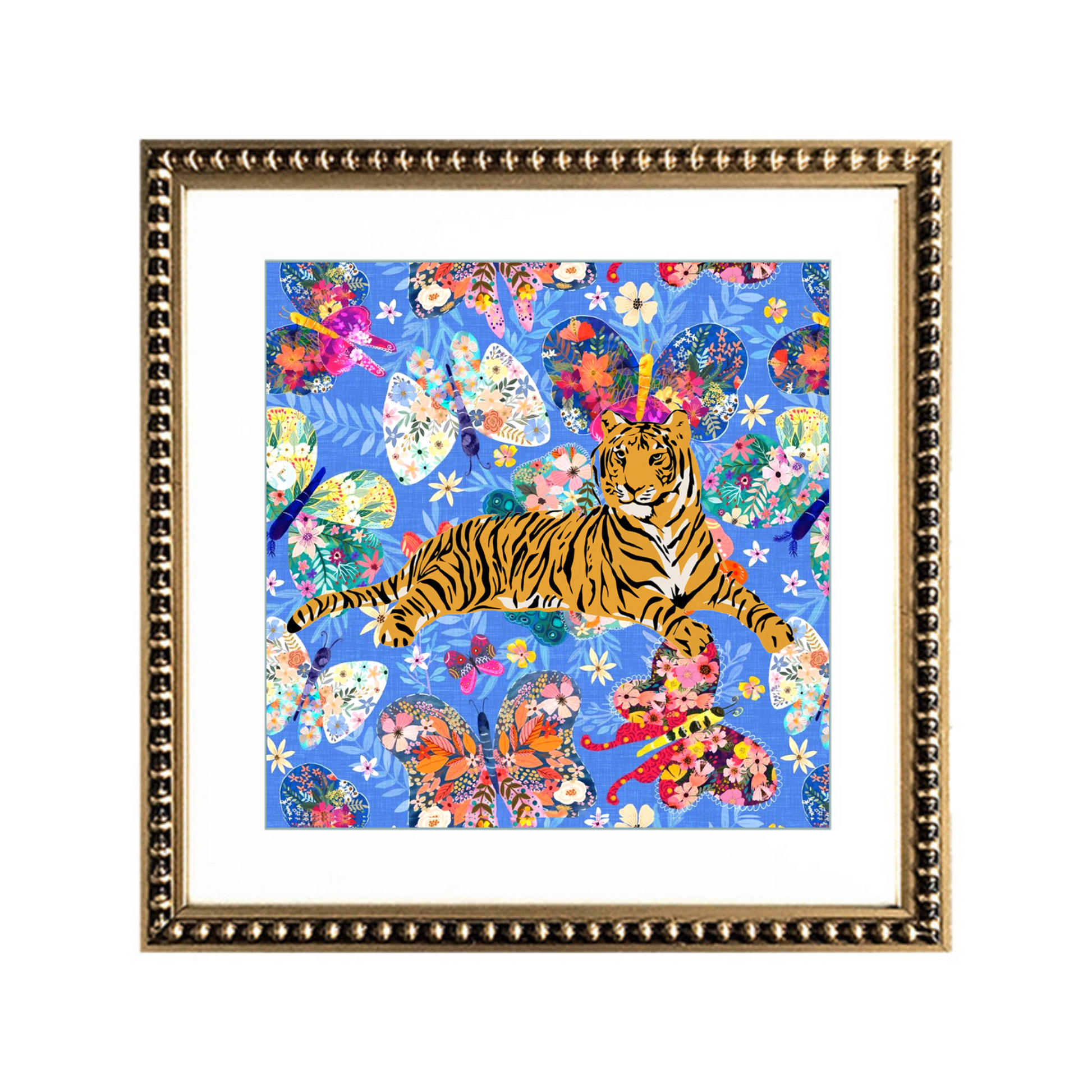 Cuadro con diseño de tigre recostado sobre fondo de mariposas y flores, paspartú blanco y marco de madera delgado dorado con perlitas.