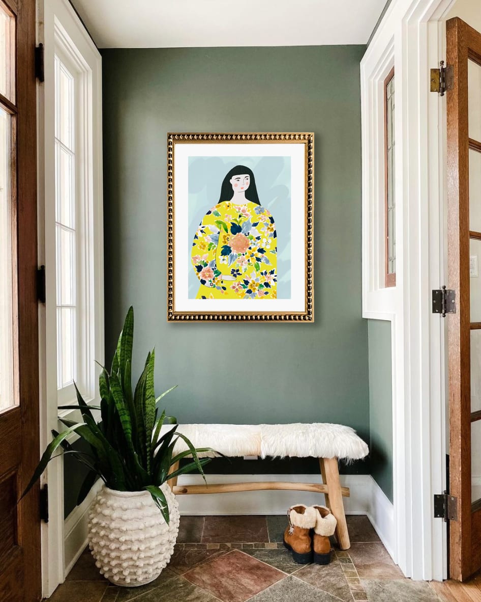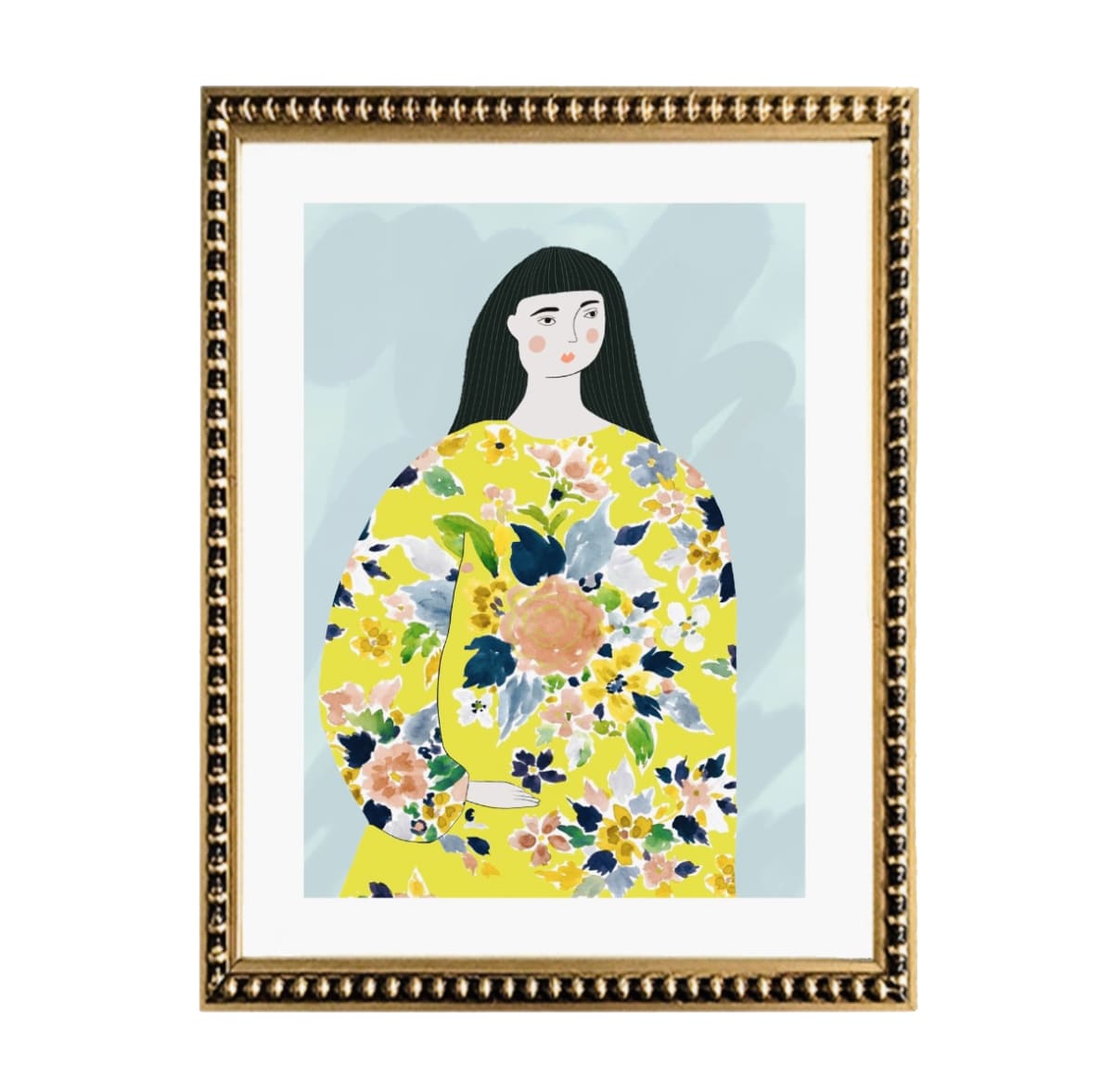 Cuadro de ilustración de mujer en tonos amarillos, azules, verdes y flores, paspartú blanco y marco de madera con perlas color dorado envejecido.
