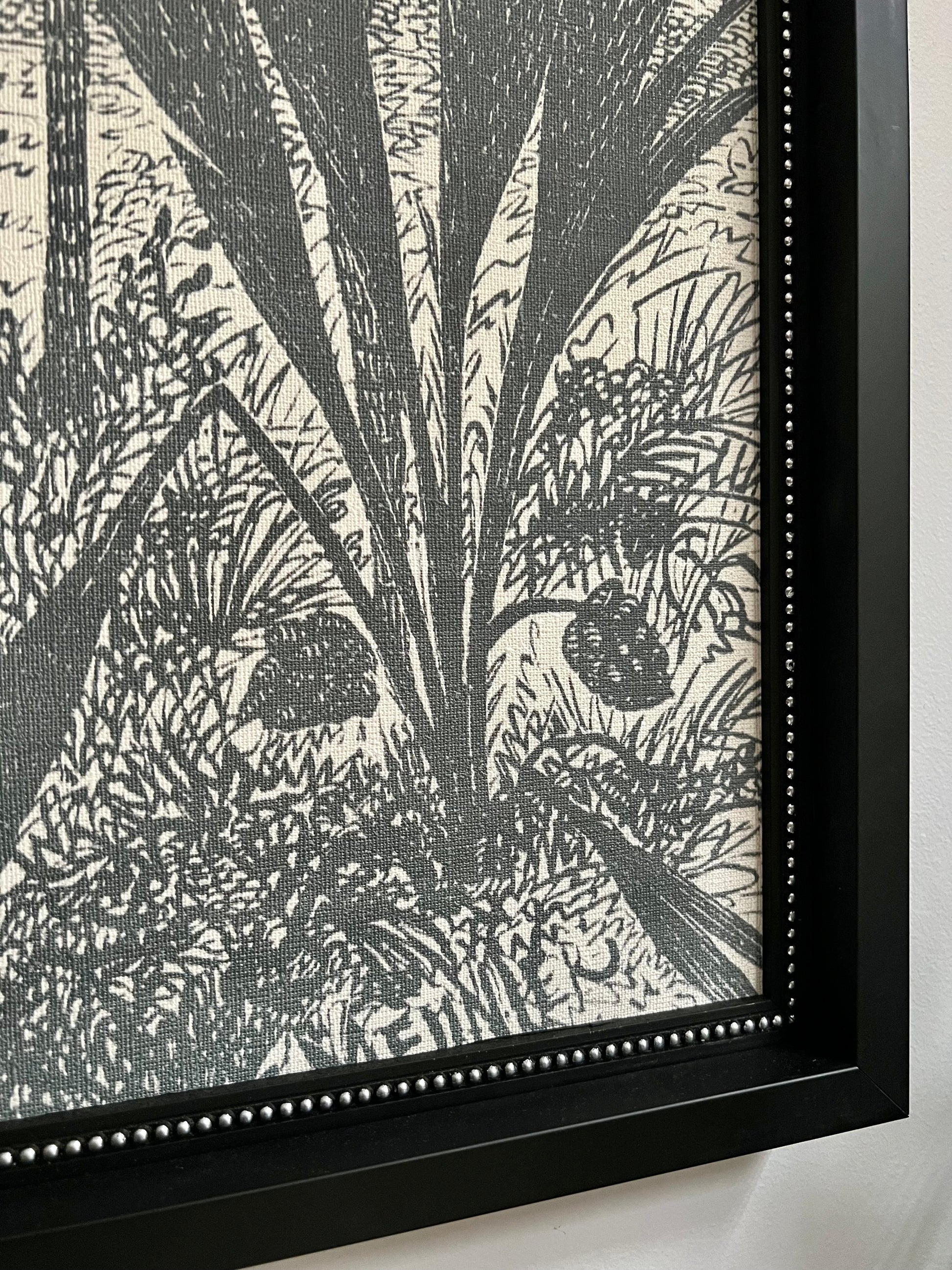 Maravilloso par de cuadros XXL con diseño de araucarias, impreso en papel con textura lino, con doble marco, filete negro con perlitas plata y caja negro. Sin vidrio.