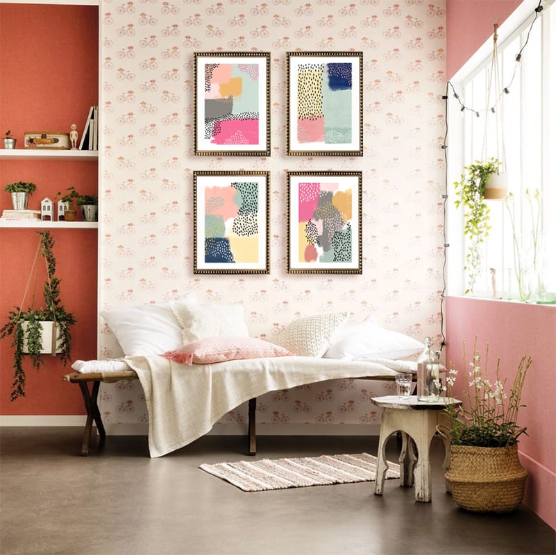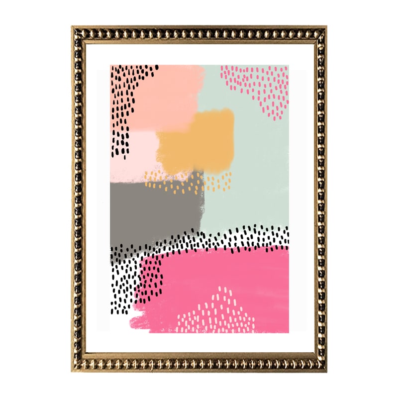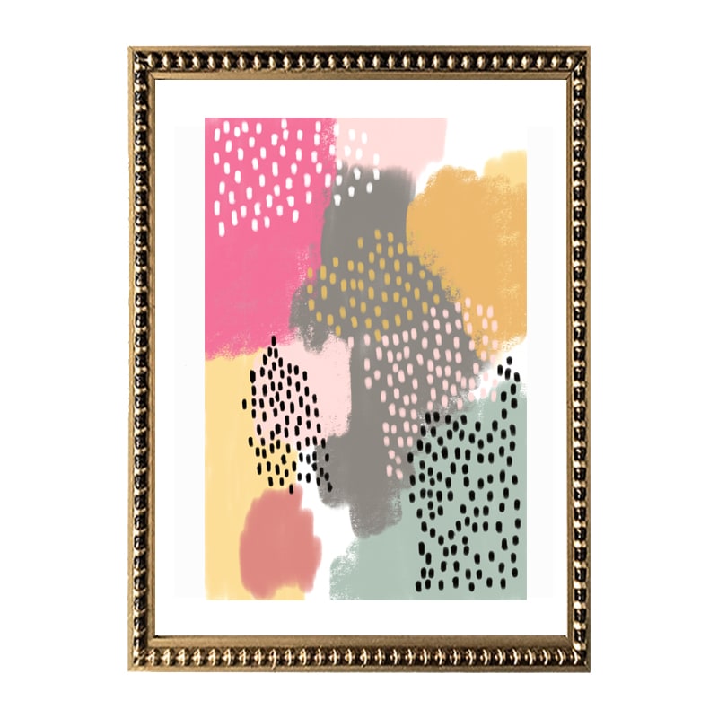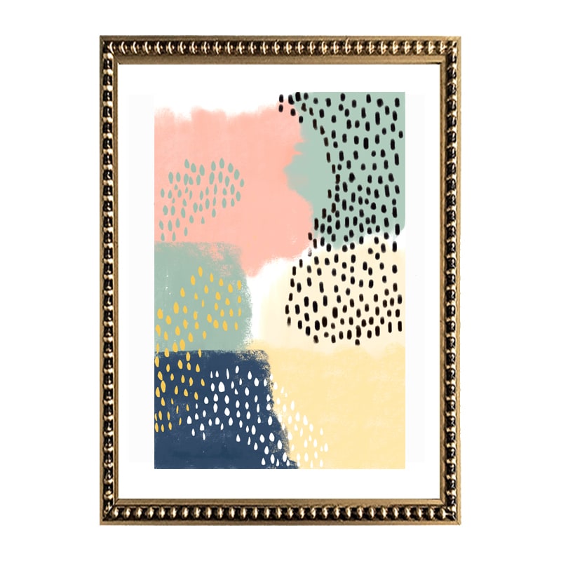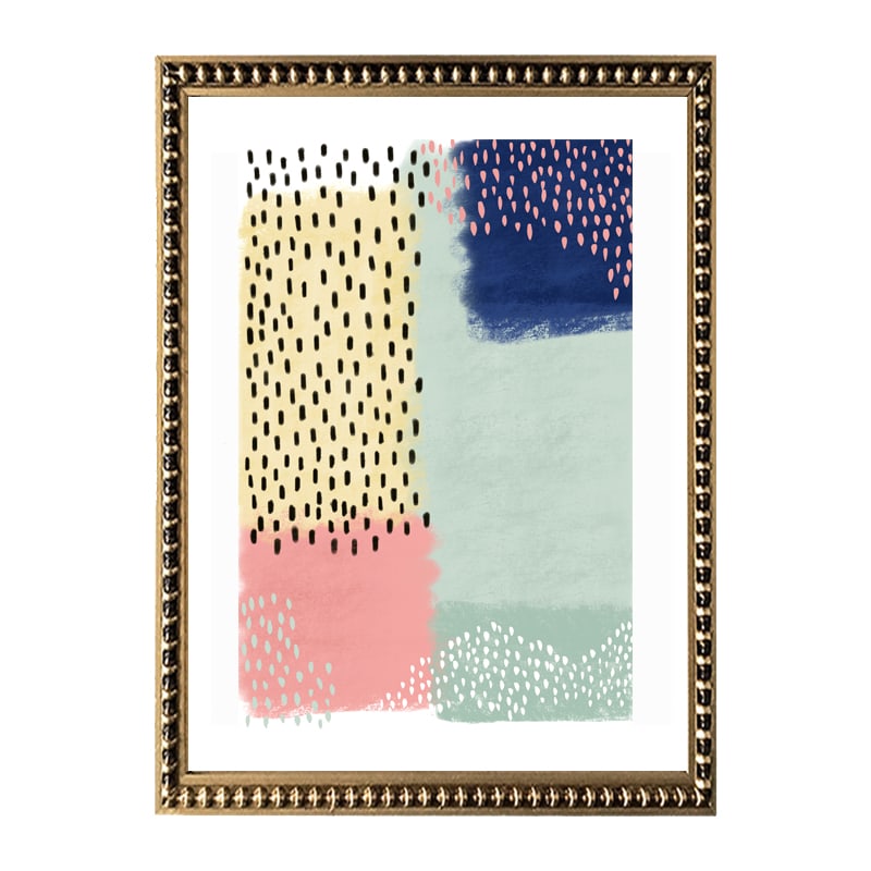 Pack de 4 cuadros de diseño abstracto de colores con paspartú blanco y marco dorado con perlas.