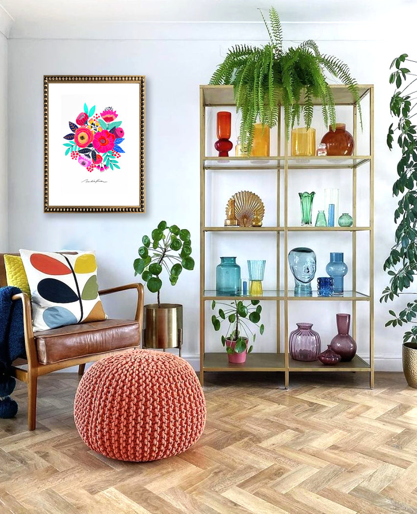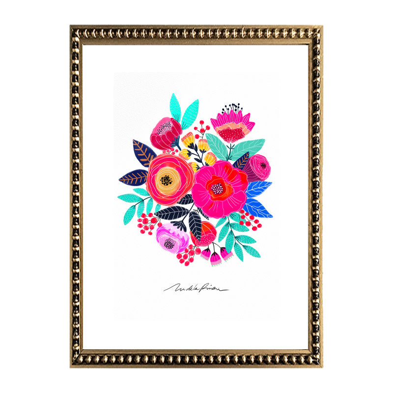 Cuadro de diseño de ramo de flores en full color, paspartú blanco y marco de madera con perlas color dorado.
