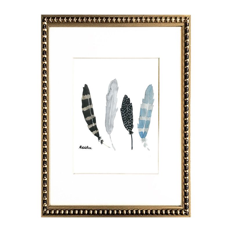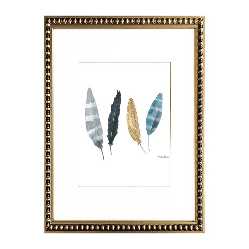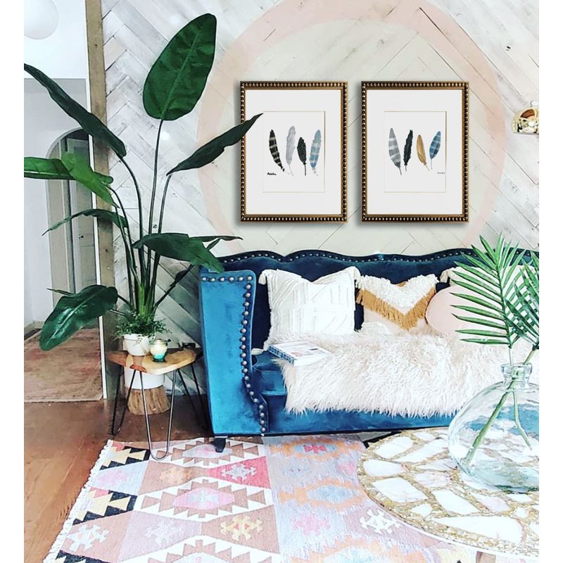 Dos cuadros de plumas con paspartú blanco y marco perla oro.