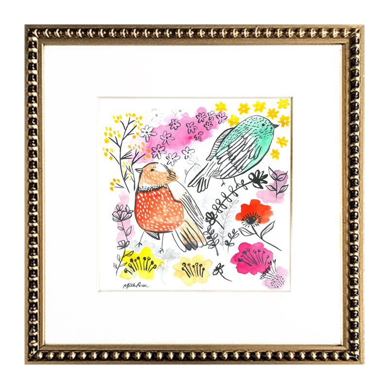 Cuadro reproducción de pareja de pajaritos en acuarela, paspartú blanco y marco de perlas dorado.