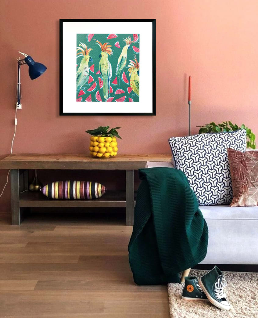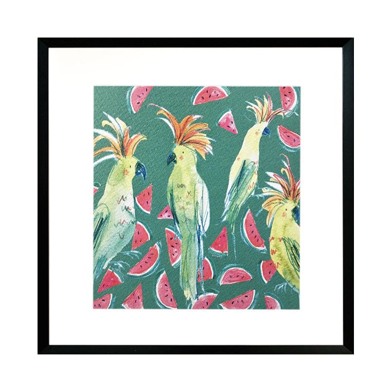 Cuadro reproducción de pintura de loros en fiesta tropical, con paspartú blanco y marco liso negro.
