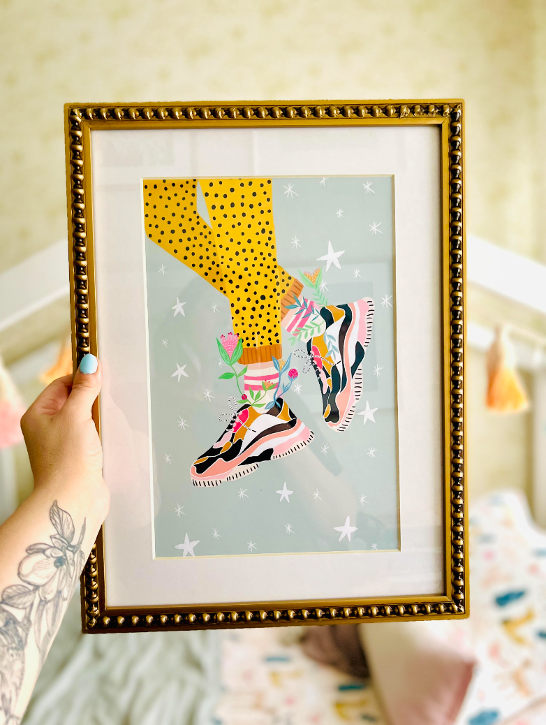 Cuadro de zapatillas en color con paspartú blanco y marco de madera dorado con perlitas.