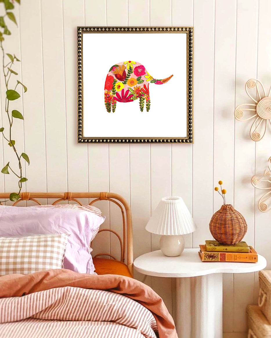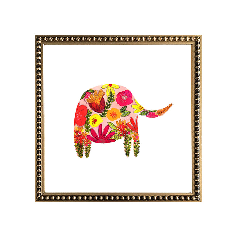 Cuadro de lámina de elefante de flores, paspartú blanco en marco perla dorado.