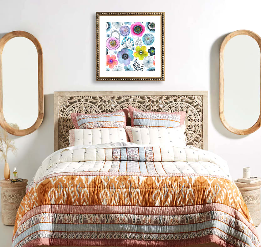 Cuadro de impresión de flores en acuarela, paspartú blanco y marco de perlas dorado.