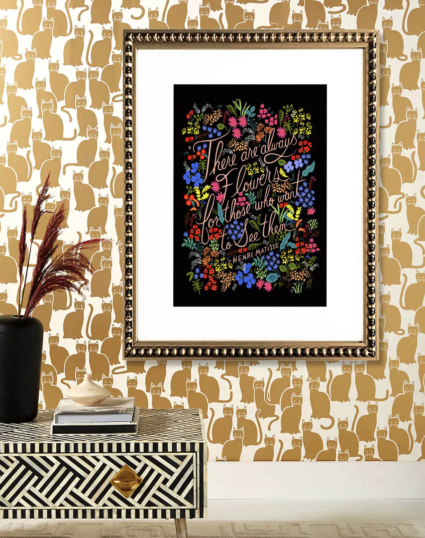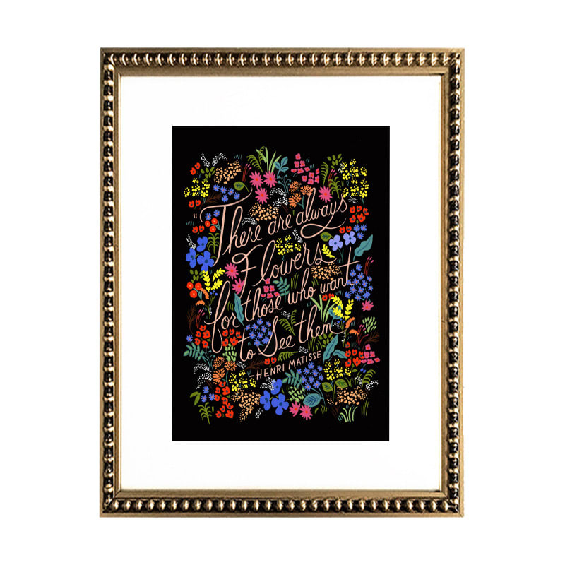Cuadro de flores y texto en fondo negro, paspartú blanco y marco de madera con Perlas color dorado envejecido.