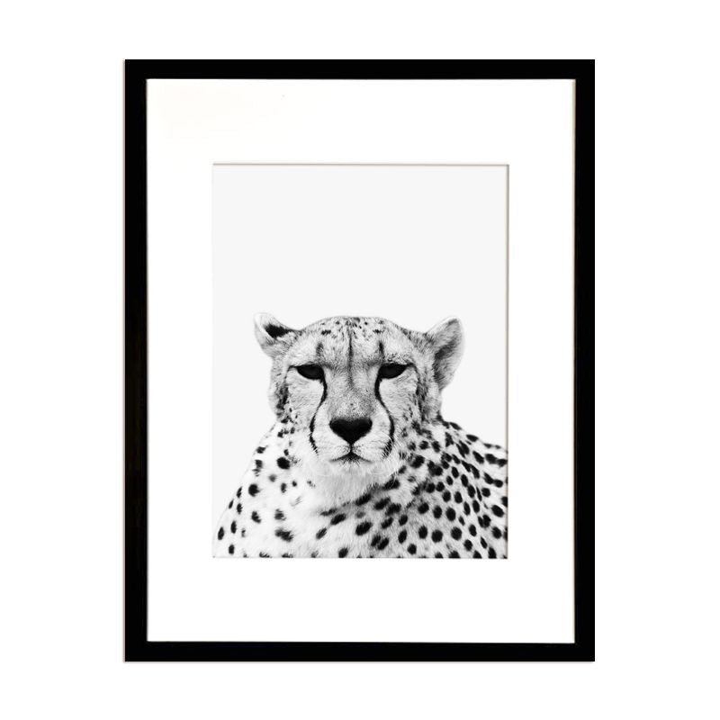 Cuadro de fotografía de cheetah, con paspartú blanco y marco negro.
