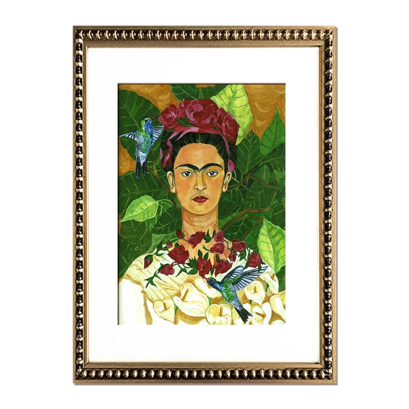Cuadro reproducción de pintura de frida en jardín de flores con paspartú blanco y marco perla dorado delgado.
