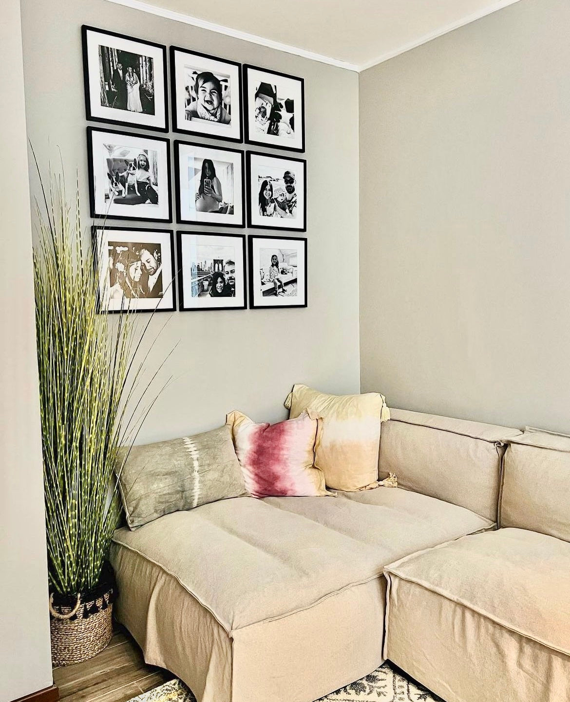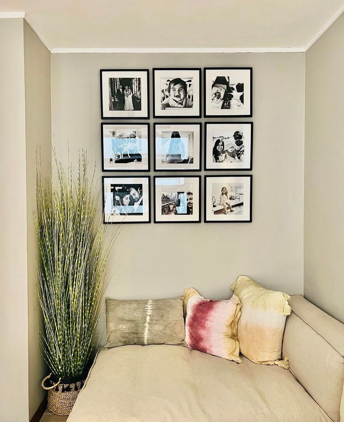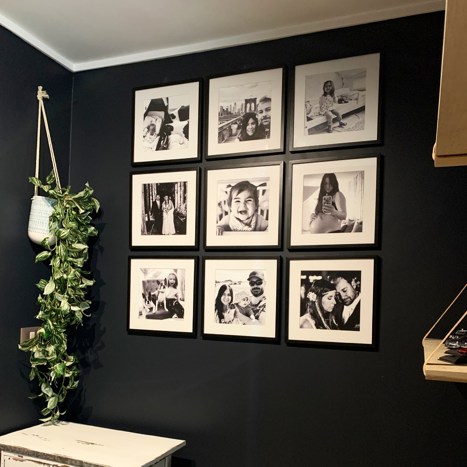 Proyecto de galería de fotos compuesta por 9 cuadros con fotografías en blanco y negro o a color, paspartú blanco y marco negro.