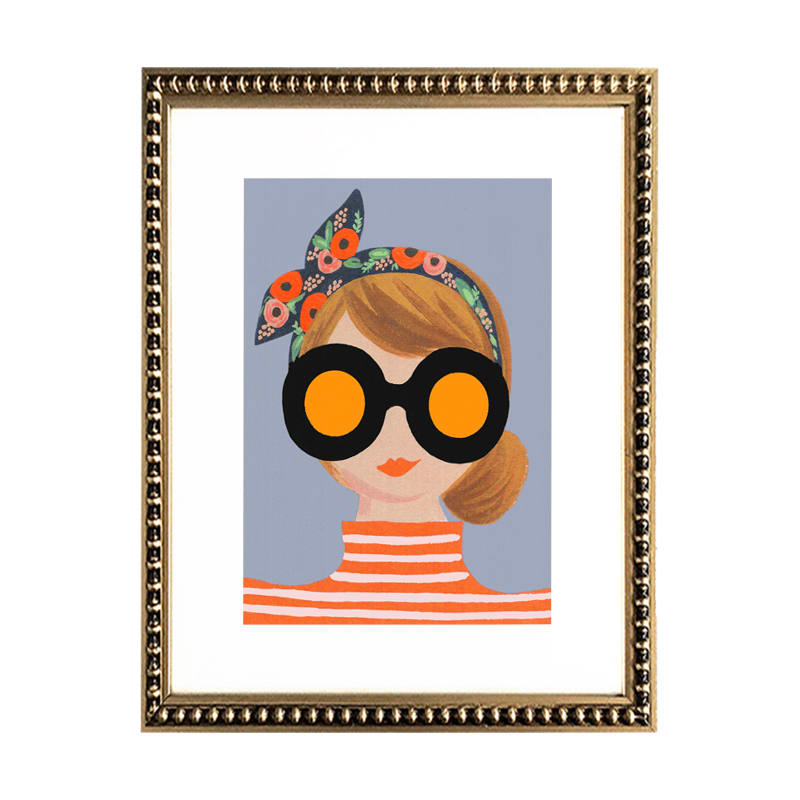 Cuadro con lámina impresa de ilustración de mujer, paspartú blanco y marco delgado de perlas color dorado.